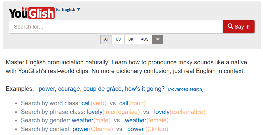 YouGlish.com, a video search engine that provides video-based examples of words and phrases in real speech, offers a solution (see Figure 1). Words can be searched by regional accent (US, UK, Australian, etc.), word class, phrase form, topic, context, and a speaker’s gender. This allows for highly specific searches that help learners focus on key vocabulary in context.